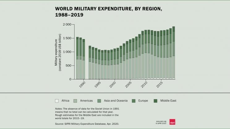 Total global military expenditure rose to $1917 billion in 2019, according to new data from the Stockholm International Peace Research Institute.