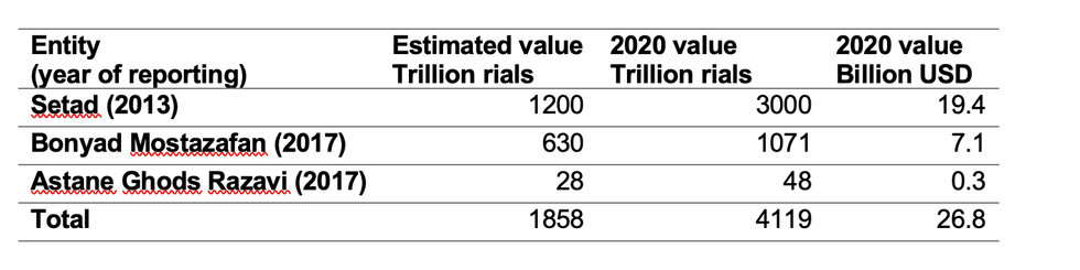 The table below compares the current value of the assets held by the holding companies under the Supreme Leader’s control. These estimates are to be taken with a large grain of salt as the studies on which they are based are not published or vetted by independent sources. But they are useful to get an idea of the orders of magnitude.