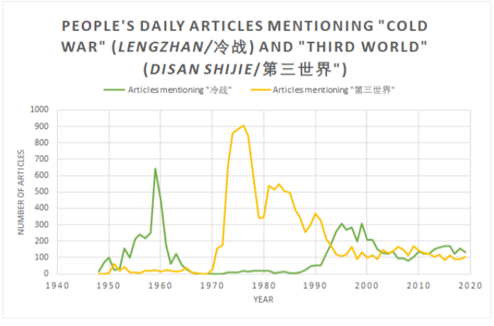 Then in the 1990s, as the Cold War ended, there was a resurgence of “cold war” talk, accompanied by a decline in references to the Third World. Articles using the “cold war” terminology from about 2000 onward use it to criticize the approach to China taken by other countries — usually the U.S., but also frequently Japan, South Korea, and India — as unnecessarily hostile and zero-sum.