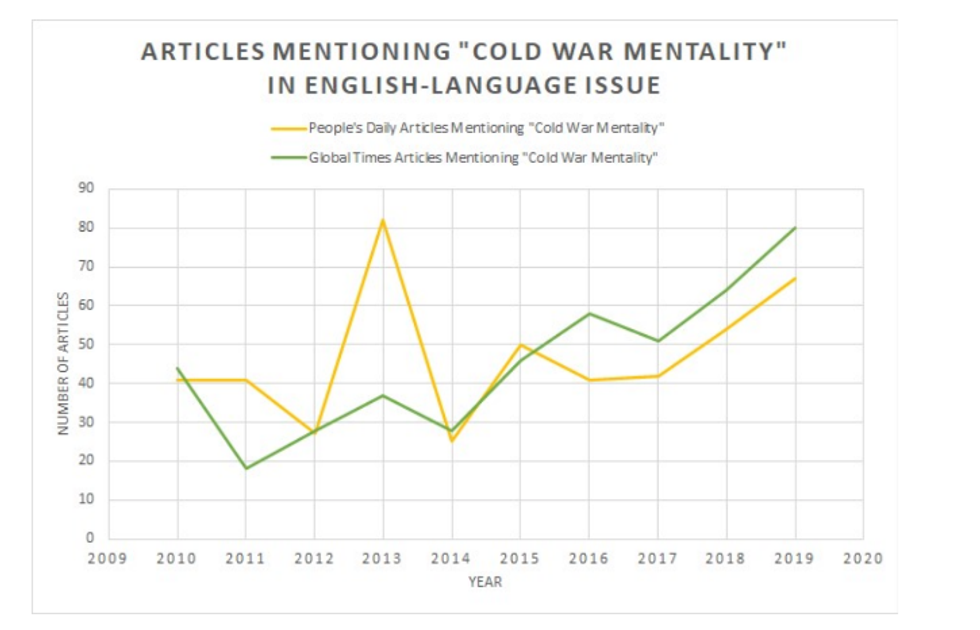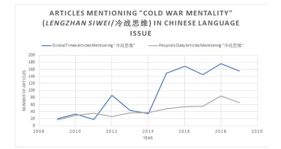 There is some evidence that the criticism and concern about this approach is growing in China. Searches for “Cold War mentality” in English and Chinese across the archives of the People’s Daily and the Global Times yield some interesting data.