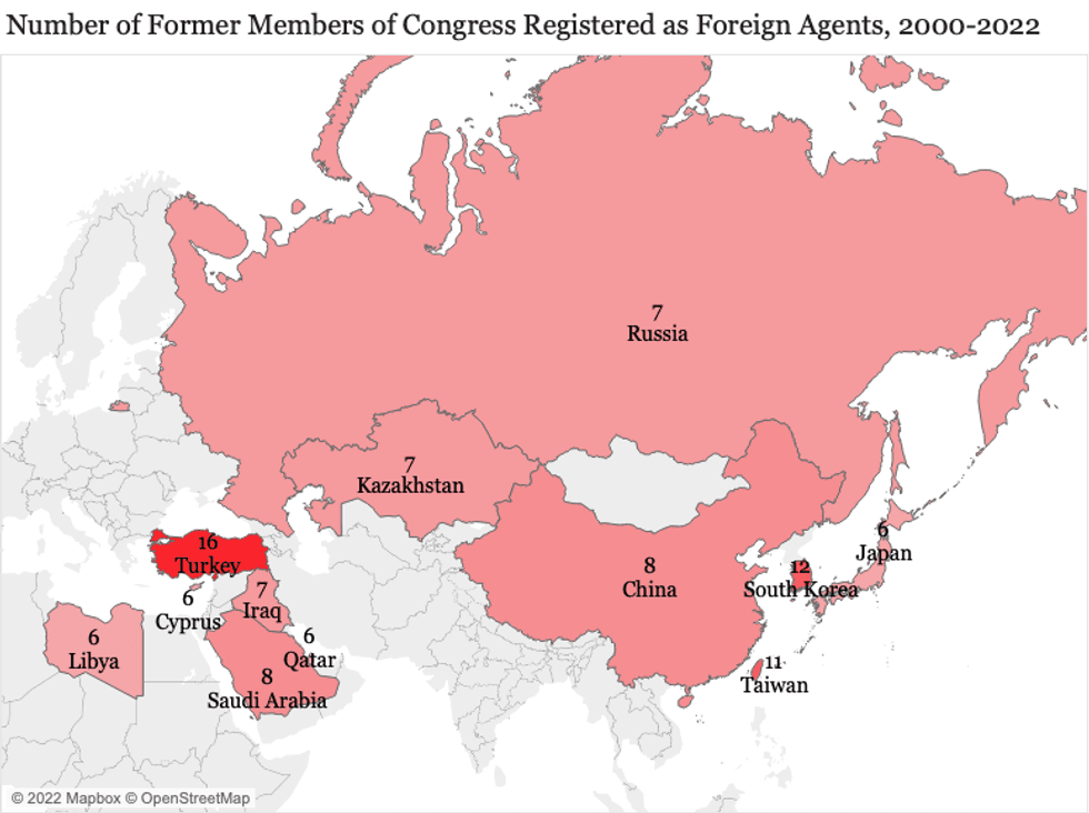 While China and Saudi Arabia’s influence operations benefited from a cadre of former members, they were far from the most represented by former elected officials. That distinction goes to Turkish interests, which had a whopping 16 former members of Congress working on their behalf.