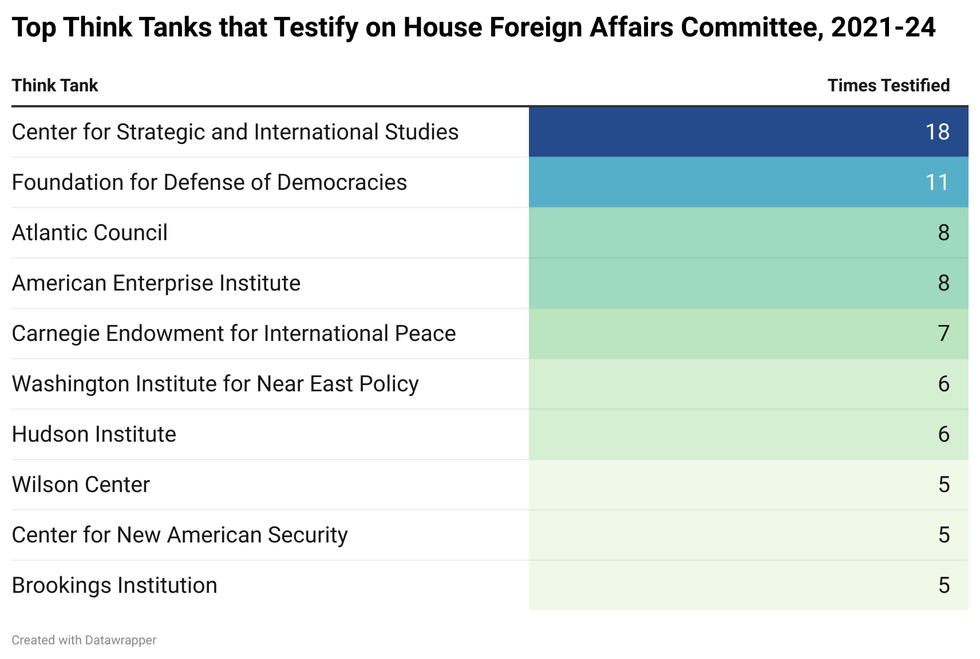 In practice, hearings often give experts whose employers are funded by special interests a platform to publicly lobby Congress. From 2021 to 2024, 378 non-governmental witnesses testified before the House Foreign Affairs Committee, the House body that oversees foreign assistance, war powers, and arms exports, among other key foreign policy-making decisions. Just over one third of those witnesses — 137 of them — came from the world of think tanks.