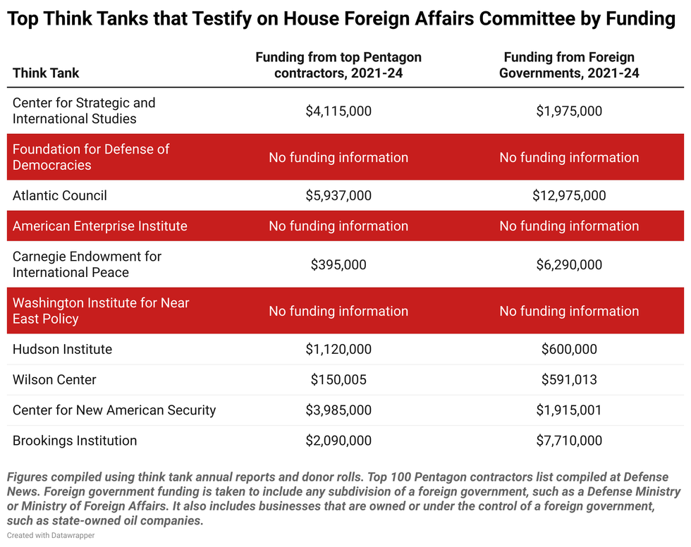 And, the money flowing from Pentagon contractors and foreign governments to these think tanks hasn’t been trivial. As documented in a forthcoming Quincy Institute brief on think tank funding, between 2021 and 2024, think tanks that were represented on the witness stand received at least $20 million dollars from the top 100 Pentagon contractors and $64 million from foreign governments. Though, the real number is likely much, much, higher, given the murky world of dark money think tanks, anonymous donors, and misleading funding ranges.